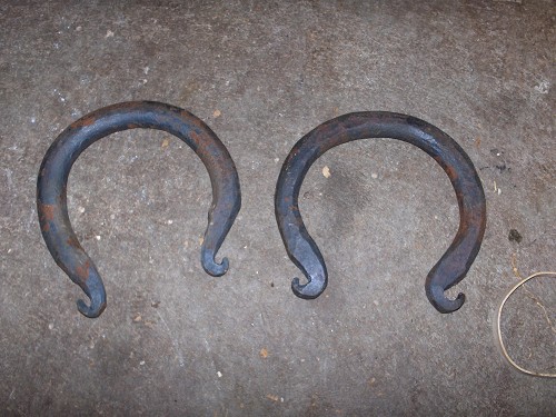 Kjøpte meg ny hest i mars. En 4 åring. Har litt etter hvert vist seg at han sparker i boksveggen om natta. Ikke så mye under foring, men fikk etterhvert hevelser på begge hasene. Ettersom han står på nok dekke, og rimlig mye ute, var det ikke der problemet kunne ligge. Flere mente nok at det kom av sparking i veggene. Da problemet ble så alvorlig at han ble halt, satte jeg han ut på gress... dessverre viste det seg at han ikke tåler/liker de norske fluene, mygg, klegg mm. Så måtte ta han inn etter ganske kort tid... Men da kom jo sprke problemet tilbake. Han er en veldig rolig hest, men liker ikke å være alene. Sjekka litt rundt og kom over noe som kalles sparke ringer eller massasje ringer fra Monty Roberts. Disse har jeg ikke sett er til å kjøpe noe sted. Snakka litt med smeden min, og vi ble enige om at dette var noe som kansje kunne være verd å prøve... så mange andre alternativer er det jo heller ikke... Ringene lages av rund jern og smis som en hestesko i formen. ringene skal ligge nede på kronranden, og virker på den måten at når hesten sparker vil ringen løfte seg opp, og når sparket "stopper" helt ytterst vil ringen "smelle" ned på kronranden, og da vil hesten merke det som om når vi sparker tåa inn i feks et stol ben... dvs veldig vondt. Hesten vil da ikke prøve dette igjen...