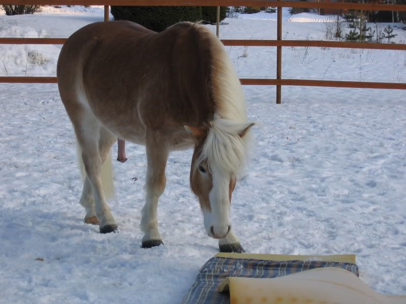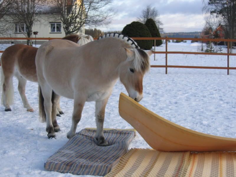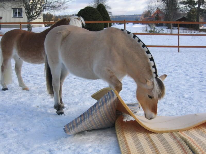 Uttrykket på hesta var bare helt komisk, søtt og artig, da jeg slapp dem ut til overraskelsen som lå og ventet på dem i luftegården. Som forventet syntes Heffalompen det var noe forferdelig skumle greier og holdt først god avstand mens han blåste "trompet" i nesa si :) he he. Stjerna derimot var ikke særlig redd, bare veldig veldig nysgjerrig. Hennes ro smittet tilslutt over på Heffalompen også, slik at hans nysgjerrighet vek unna istedet for redsel og fryk.