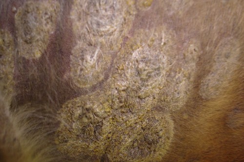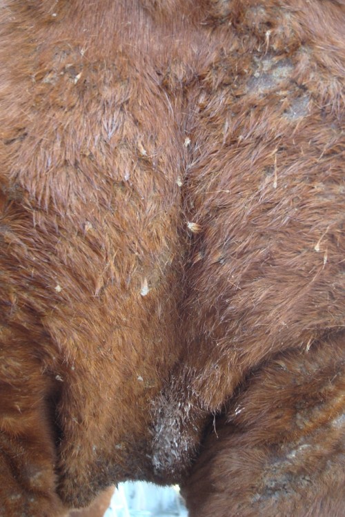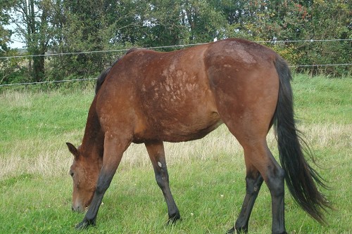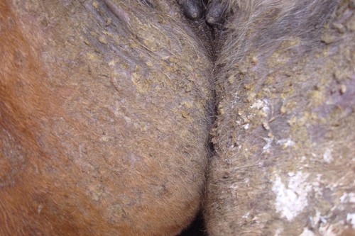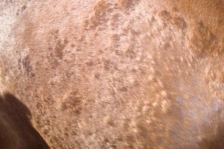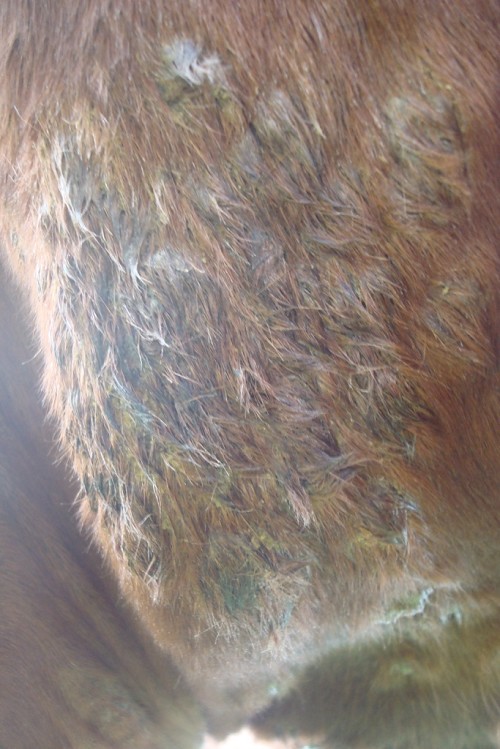 Er det noe ute på beitet hun reagerer på? Håper dette "utslettet" ikke går så veldig dypt i underhuden, for det kan resulterer i arrdannelser der- og det er ikke mykt og tøylig som frisk,uskadet underhud.