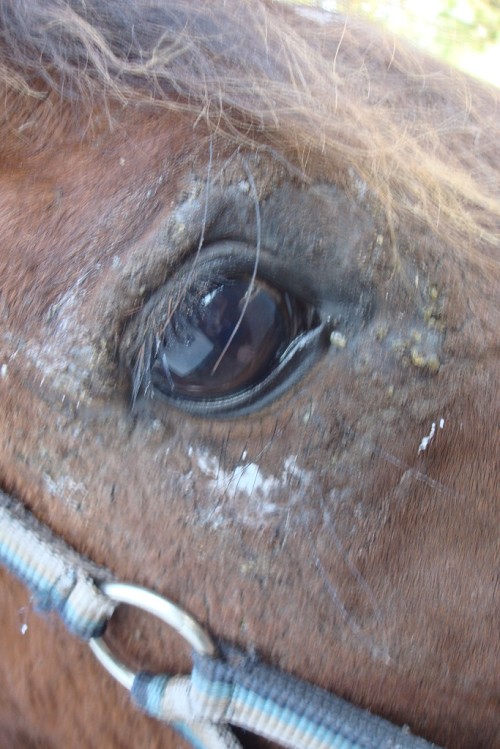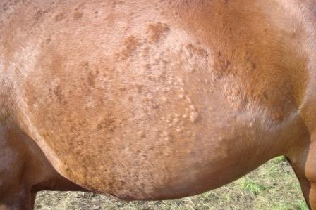 Min hest fikk kunn små blemmer mest under magen og på magen og rygg. Han viste ikke smerter men kunn ubehag når vi rørst på disse stedene..